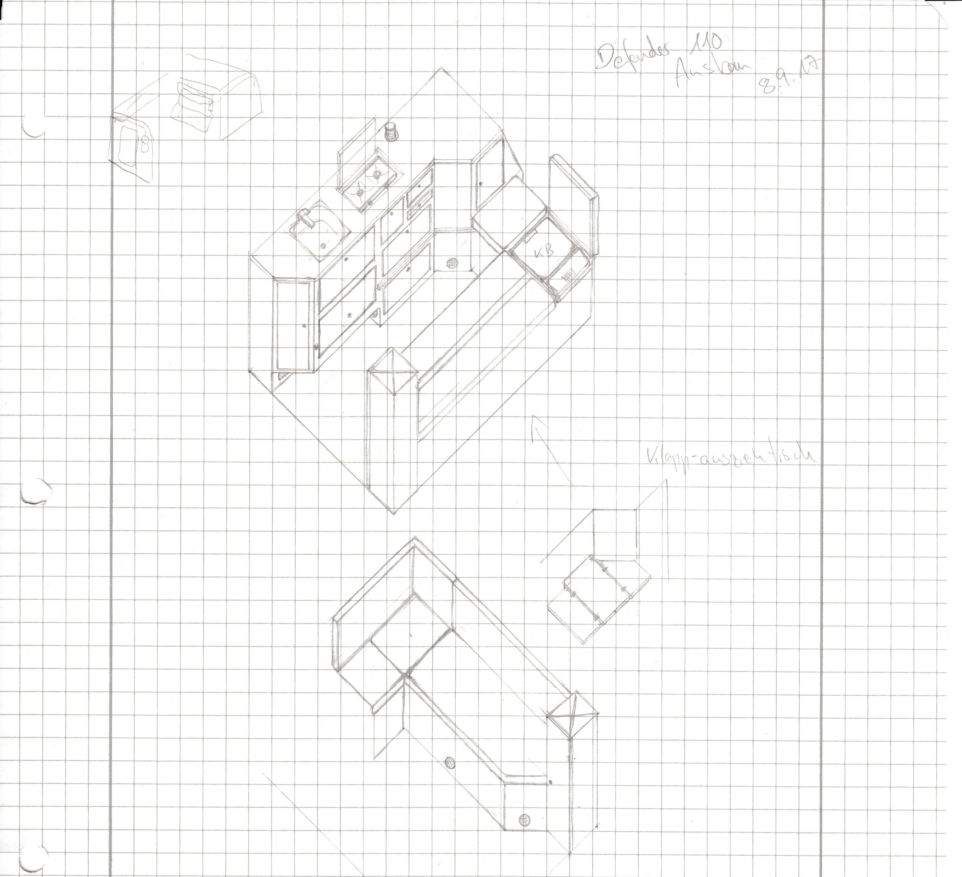 Ziemlich bald liebäugelten wir mit dem Land Rover Defender. Der hat Allrad und ist in einem einigermaßen guten Zustand, mit einem Alter von 18 Jahren und 180.000 km, ab 13.000 € zu erhalten. Ideen und Skizzen zum Innenausbau folgten, jedoch ist die Wohnfläche vergleichsweise klein und vor allem zu niedrig (Jan ist knapp 2 Meter groß). Wenn man also gezwungen durch z.B. schlechtes Wetter doch mal mehr Zeit im Wagen verbringt, so könnte man im Defender fast nur liegen bzw. sitzen, naja hocken. Natürlich gibt es Möglichkeiten den Wohnraum zu vergrößern zum Beispiel mit einem Hubdach, diese werden angeboten von Firmen wie Alu-Cab, ExTec, X-Vision-X. Leider kommt hier wieder der Preis ins Spiel, ein Hubdach kostet nämlich 8.000 € oder mehr. Schade, denn der Defender gefällt uns wirklich gut und war lange Zeit unser Favorit.